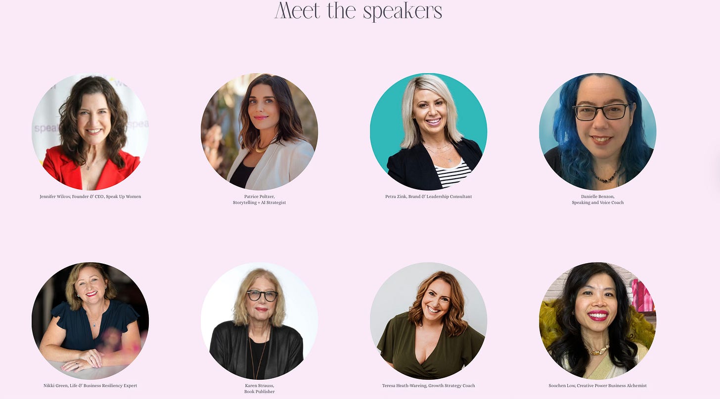 You’ll also experience the magic of 25 experts across branding, visibility, speaking, writing, launching, community building including Veronica Llorca-Smith herself, Claudia Faith, Beth Nydick, Nikki Green, Tara Geraghty (@tarasvoice), Petra Zink, Meridith Grundei , Tiffany Neuman, Laura Zug, and many others.